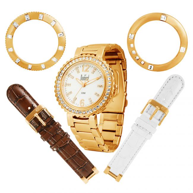 Kit com relógio analógico feito em aço na cor rosé, com pedrinhas na caixa e no mostrador, e resistente à água 30 metros. Acompanha duas pulseiras em couro nas cores marron e branco e dois aros extras.